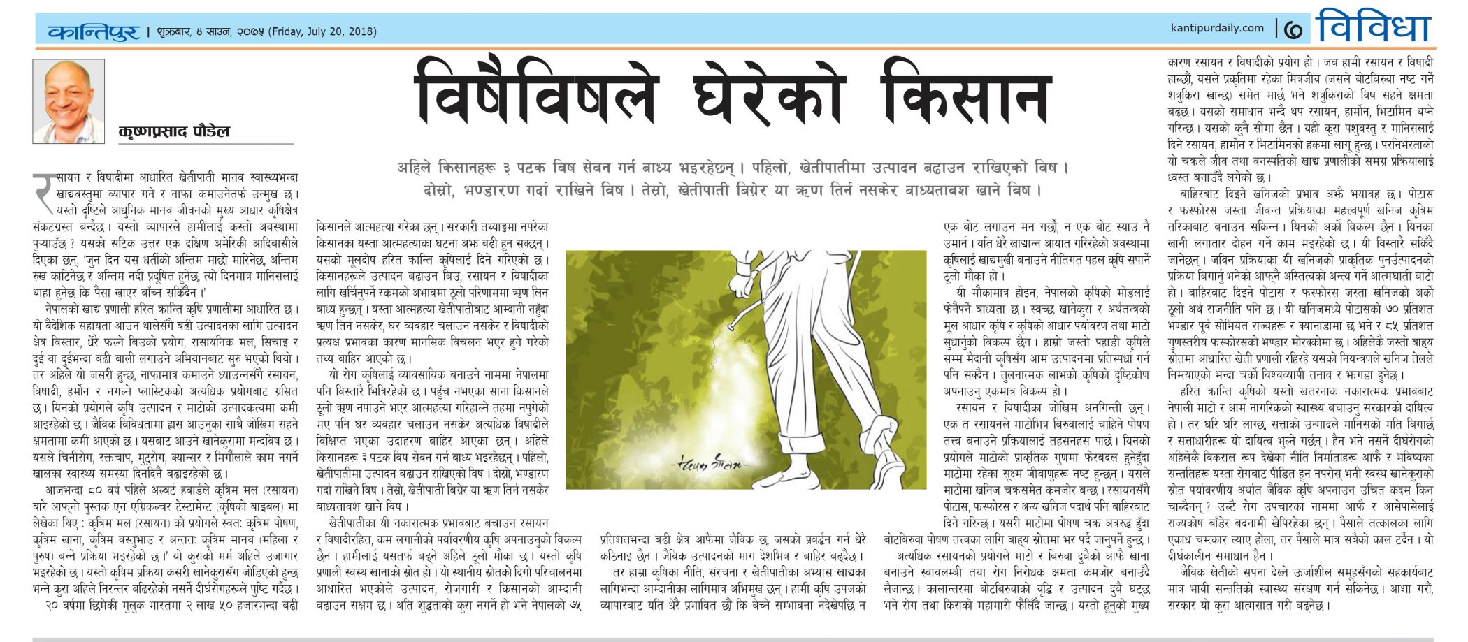 जैविक खेतीको सपना देख्ने ऊर्जाशील समूहसँगको सहकार्यबाट मात्र भावी सन्ततिको स्वास्थ्य संरक्षण गर्न सकिनेछ । आशा गरौं, सरकार यो कुरा आत्मसात गरी बढ्नेछ ।
